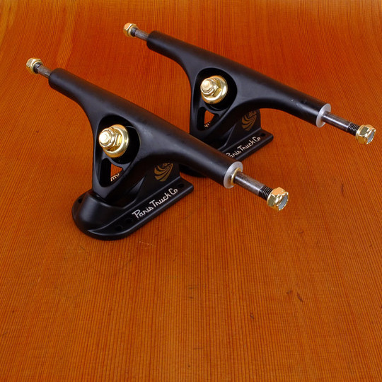 The Paris 180mm V2 50 Degree Black Matte trucks are designed for freeriding, downhill, carving, cruising, and freestyle. Gravity molded with 356.2 virgin aluminum, the hanger measures 180mm long with a 220mm axle length. Secondary heat treated for strength, the 50° baseplate provides agility and a tight turning radius. With a board side barrel bushing for stability, the road side tall cone additional maneuverability.